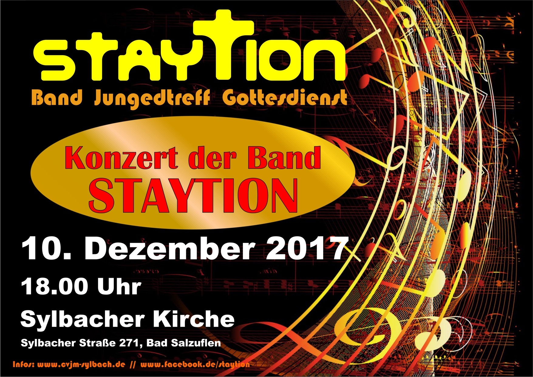 30. November 201730. Dezember 2017 von akki STAYTION special Das letzte Konzert der Band STAYTION in diesem Jahr. Ein buntes Konzert und wie immer dabei: Das Staytion-Bistro-Team mit leckerem Essen! 10. Dezember 2017 18.00 Uhr Sylbacher Kirche Teilen mit:Klick, um über Twitter zu teilen (Wird in neuem Fenster geöffnet)Klick, um auf Facebook zu teilen (Wird in neuem Fenster geöffnet) Ähnliche Beiträge