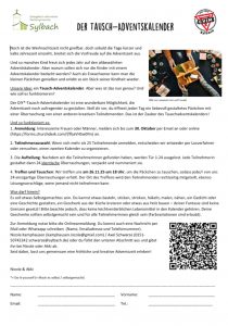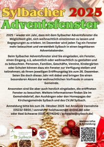 7. Oktober 20259. Oktober 2025 von akki Adventsaktionen in Sylbach Im Advent 2025 bieten der CVJM Sylbach und die Kirchengemeinde Sylbach wieder zwei tolle Mitmachangebote an: Den Sylbacher Tauschadventskalender und das Sylbacher Adventsfenster. Lassen Sie sich doch einladen, sich daran zu beteiligen: Anmeldung zum „Sylbacher Adventsfenster 2025“ — hier klicken — Anmeldung zum „Tausch-Adventskalender 2025“ — hier klicken — Teilen mit:Klick, um über Twitter zu teilen (Wird in neuem Fenster geöffnet)Klick, um auf Facebook zu teilen (Wird in neuem Fenster geöffnet) Ähnliche Beiträge