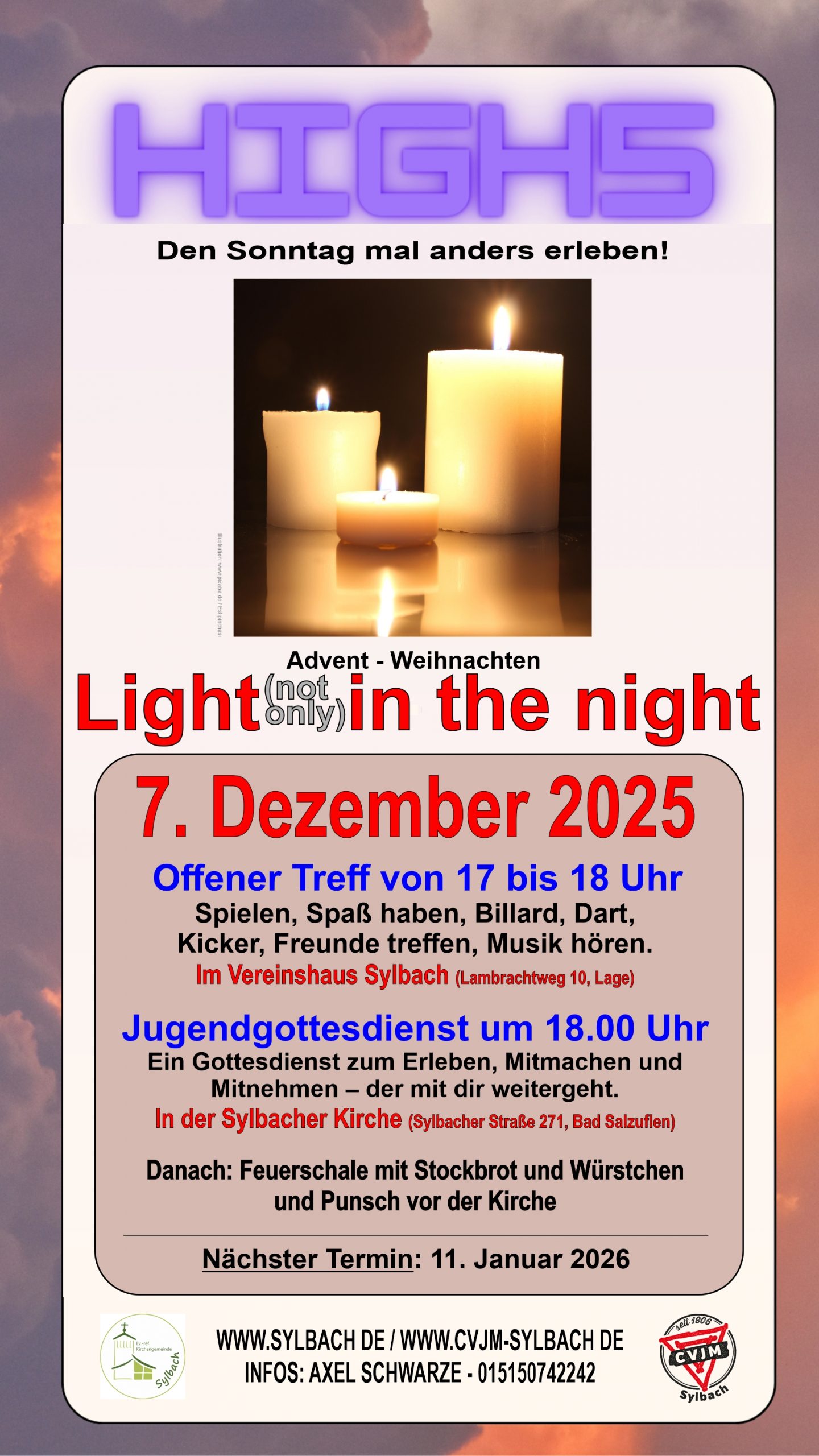 Dieses adventlichen Thema wird uns mit Dunkelheit und Kerzen durch den Abend begleiten und euch zum Erleben und Mitmachen einladen.