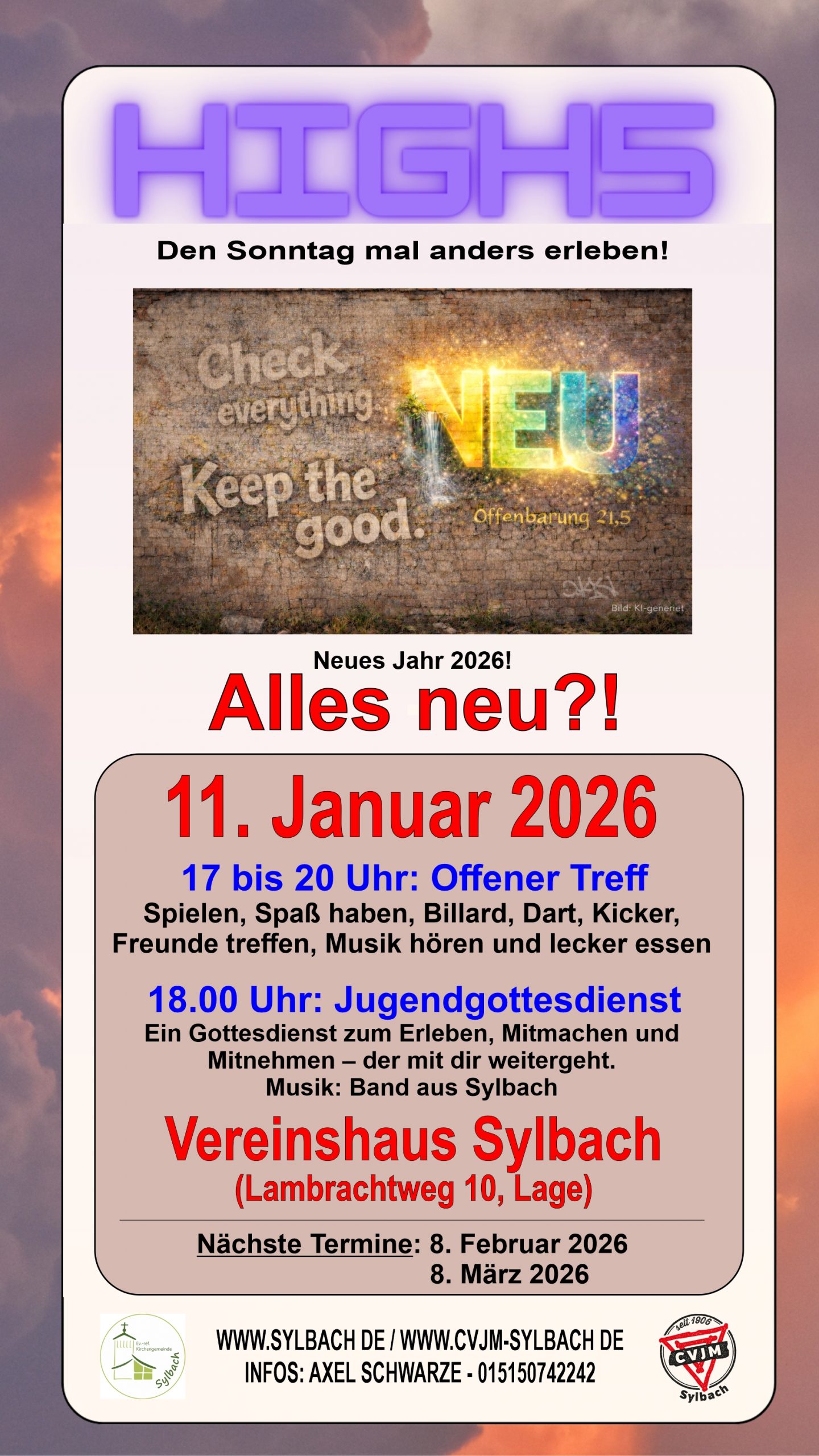 Um 18 Uhr findet der Jugendgottesdienst unter dem Motto „Alles neu?!“ statt. Ein Gottesdienst, am Anfang des Jahres, zum Erleben, Dabeisein und Mitmachen. Die Musik kommt wieder von der Band aus Sylbach.
