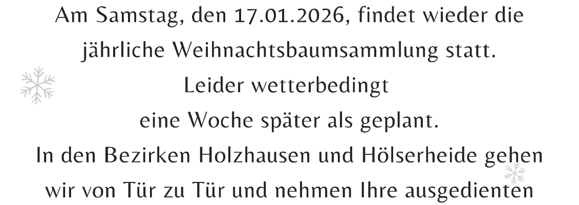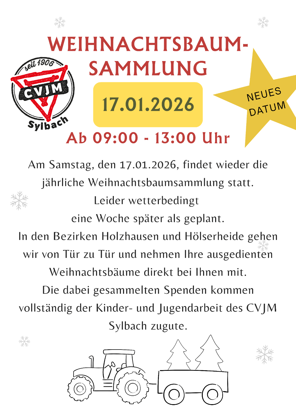 Der CVJM Sylbach sammelt dieses Jahr, am 17.Januar 2026 vormittags, wieder ausgediente Weihnachtsbäume ein.